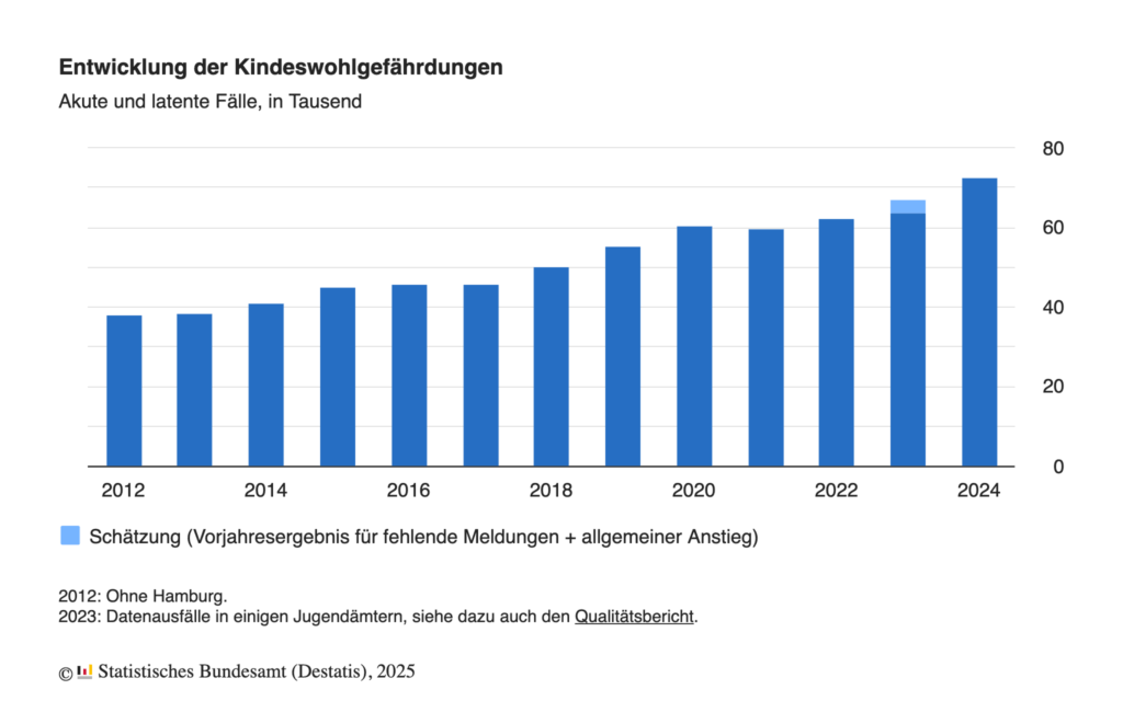 Die Zahl der Kindeswohlgefährdungen in Deutschland steigt weiter – und erreicht erneut einen Höchststand. Nach Angaben des Statistischen Bundesamtes stellten die Jugendämter im Jahr 2024 bei rund 72.800 Kindern und Jugendlichen eine akute oder latente Gefährdung ihres Wohls fest. Damit hat sich die Zahl innerhalb von fünf Jahren um fast ein Drittel erhöht. Auch im Vergleich zum Vorjahr zeigt sich ein deutlicher Anstieg.