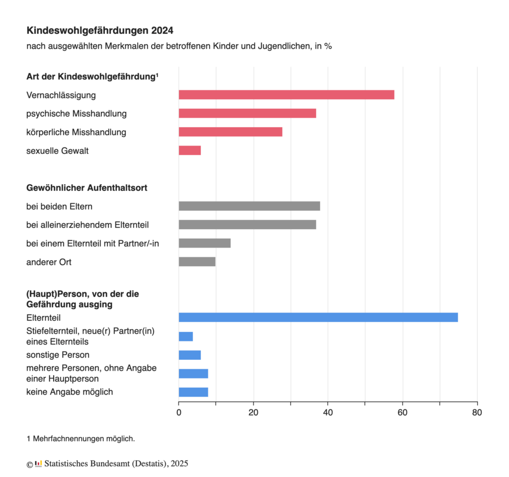 Die häufigste Form der Gefährdung war Vernachlässigung, gefolgt von psychischer Misshandlung. Körperliche Gewalt spielte ebenfalls eine relevante Rolle, sexuelle Gewalt trat seltener auf, betraf dann jedoch überwiegend Mädchen. In drei von vier Fällen ging die Gefährdung ausschließlich oder hauptsächlich von einem Elternteil aus.