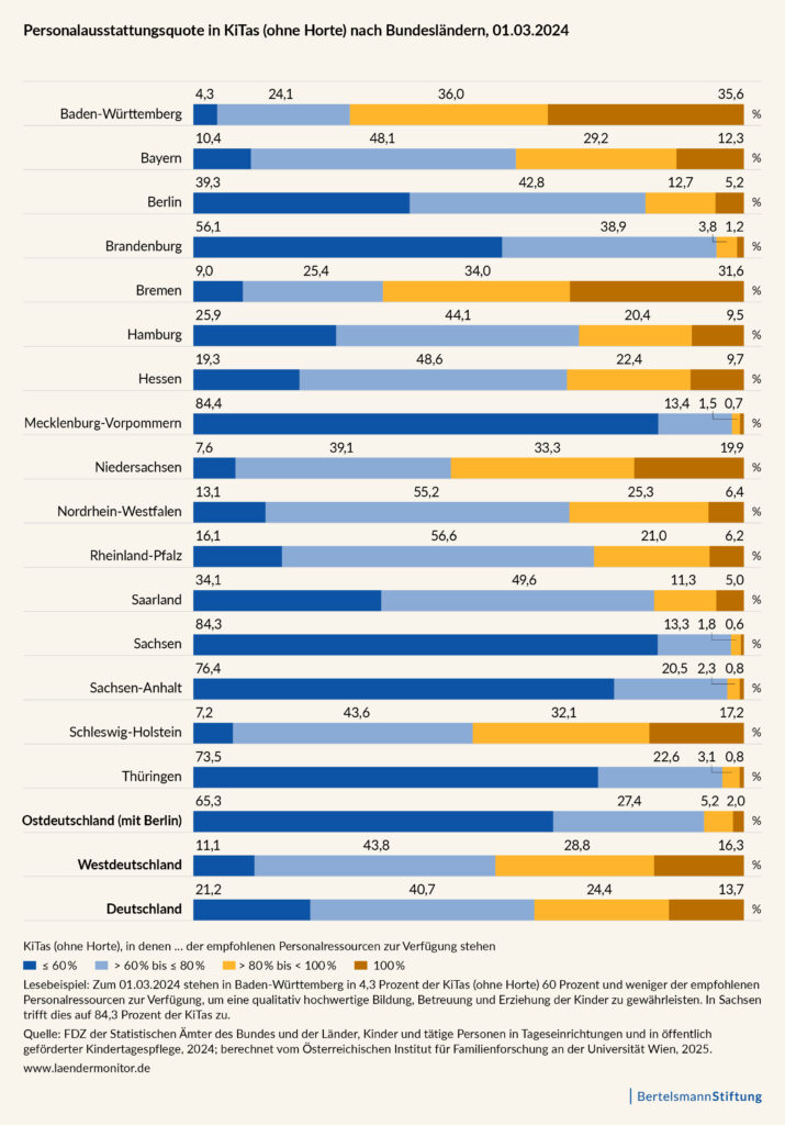 Auch zwischen den Bundesländern zeigen sich erhebliche Differenzen. Die höchsten Anteile an Kitas mit einer Personalausstattung gemäß wissenschaftlicher Empfehlung finden sich in Baden-Württemberg (36 Prozent), Bremen (32 Prozent) und Niedersachsen (20 Prozent). Besonders kritisch ist die Lage dagegen in Mecklenburg-Vorpommern und Sachsen, wo jeweils 84 Prozent der Kitas nur 60 Prozent oder weniger des benötigten Personals zur Verfügung haben. In Sachsen-Anhalt liegt dieser Anteil bei 76 Prozent.