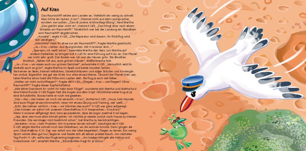 Mit „Martha Möwe bei den Außerirdischen“ liegt der dritte Band der erfolgreichen Kinderbuchreihe von Heiko Volz und Sibylle Mayer vor – und zugleich der bislang fantasievollste. Die beliebte Möwe Martha verlässt in diesem Abenteuer den vertrauten Wald und findet sich plötzlich im Weltall wieder: Eine zufällige Begegnung mit den liebenswert-skurrilen Kraxianern führt sie auf einen fremden Planeten, auf dem sie nicht nur neue Freundschaften schließt, sondern auch zur Fluglehrerin wird.